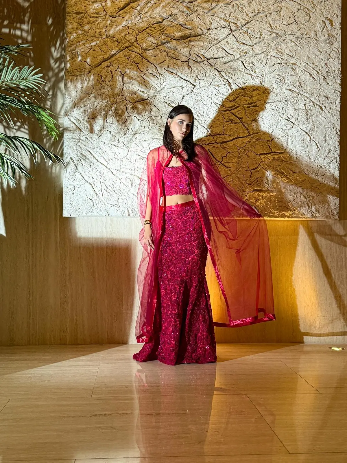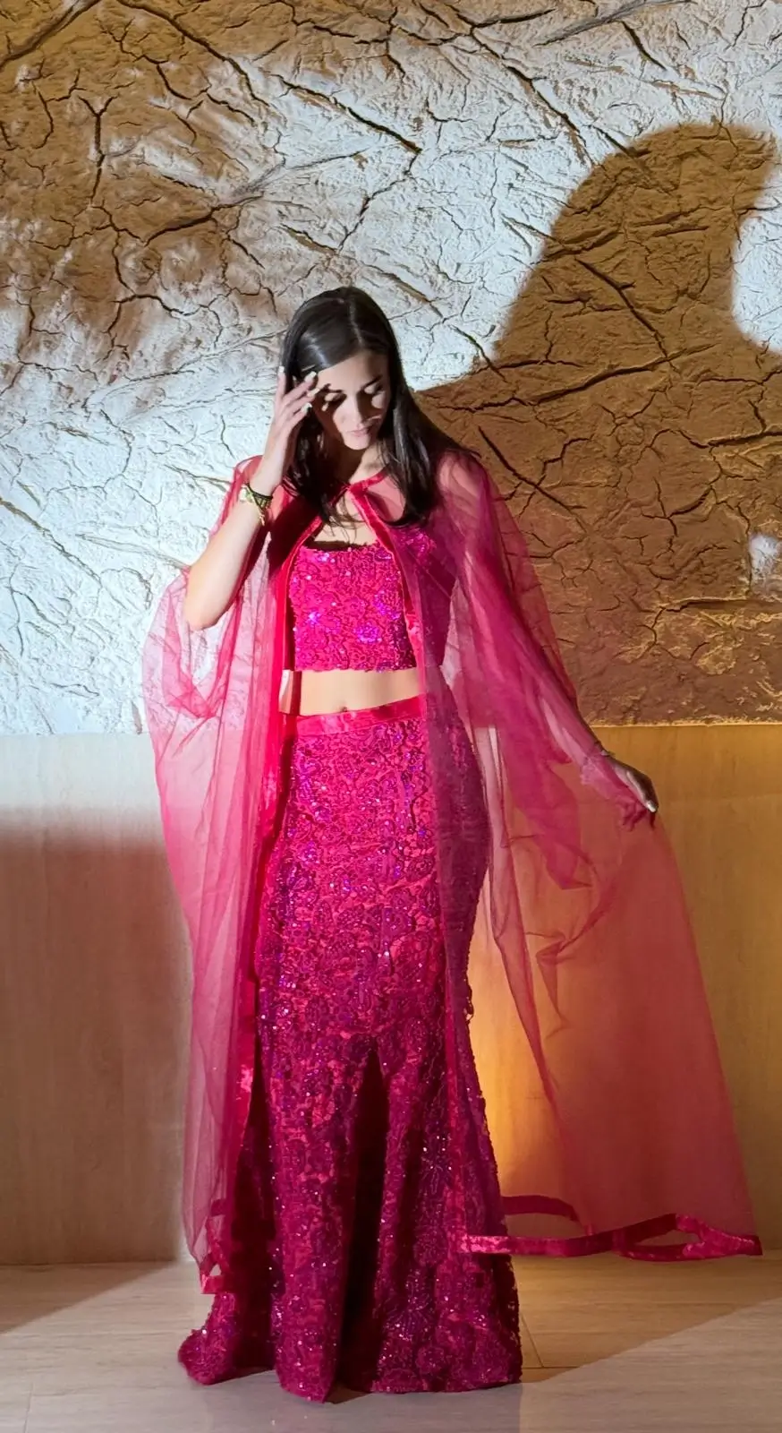 Crepe top and bottom, Tulle cape
